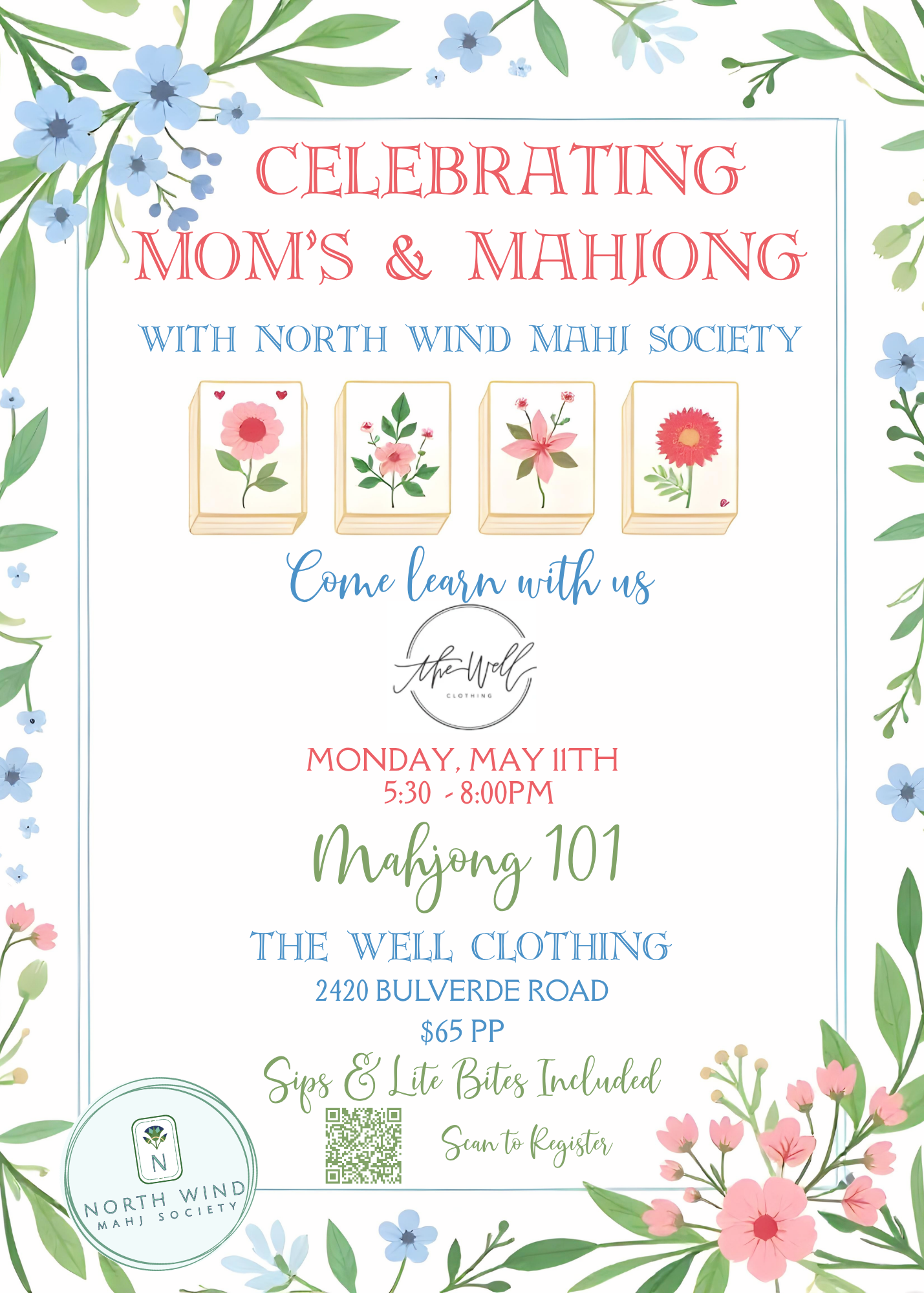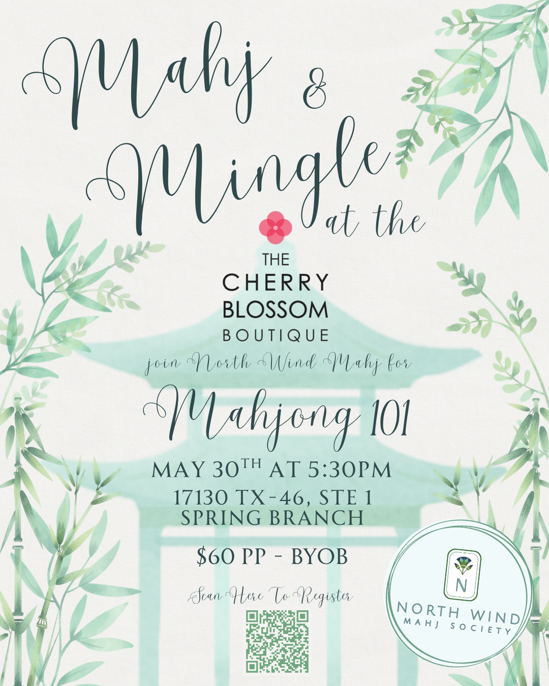 Learn to play Mahjong with North Wind Mahj Society in the beautiful setting of The Cherry Blossom Boutique! Weβre hosting a Mahjong 101 for anyone looking to learn this classic game. Grab a friend, pack your favorite beverage, and letβs get playing.